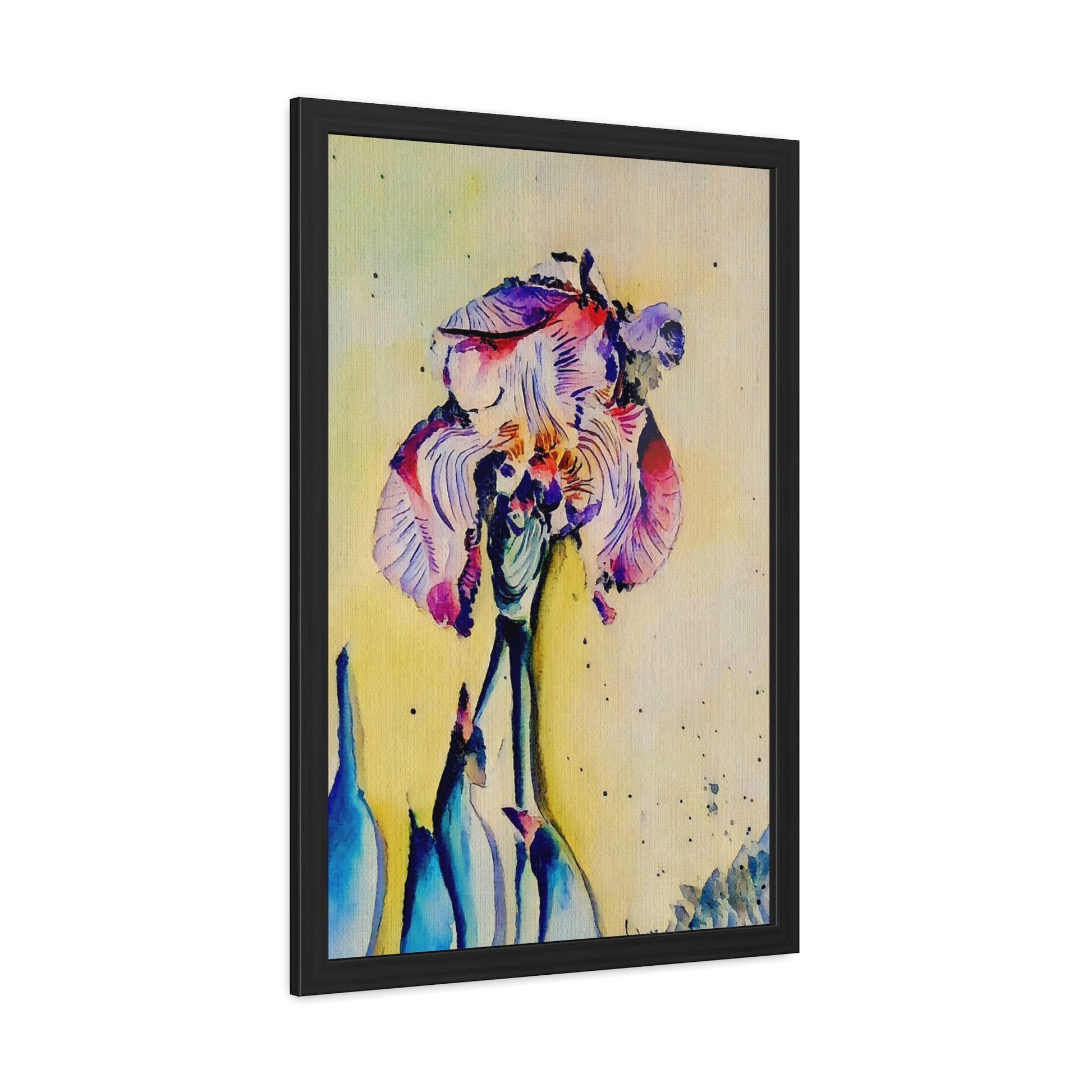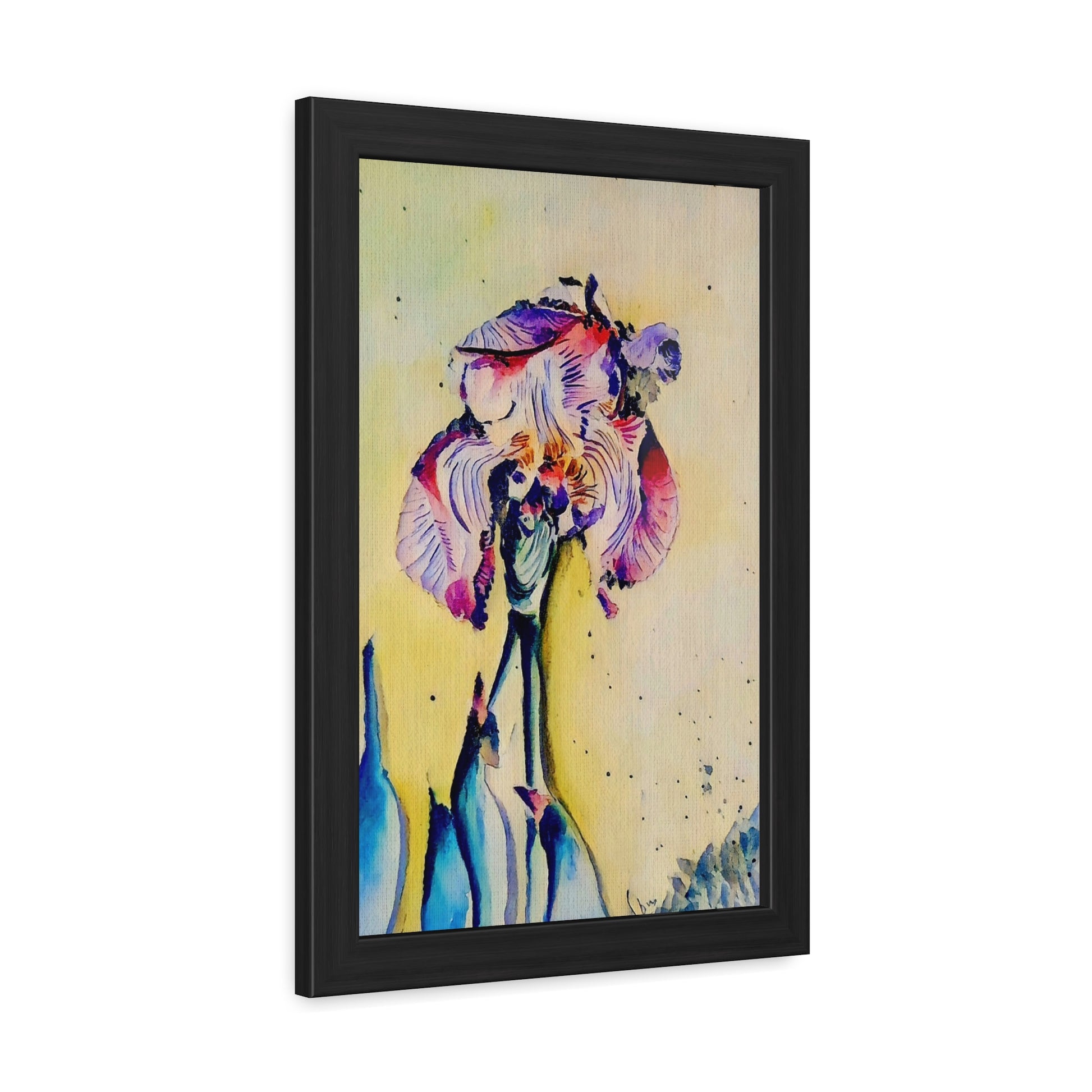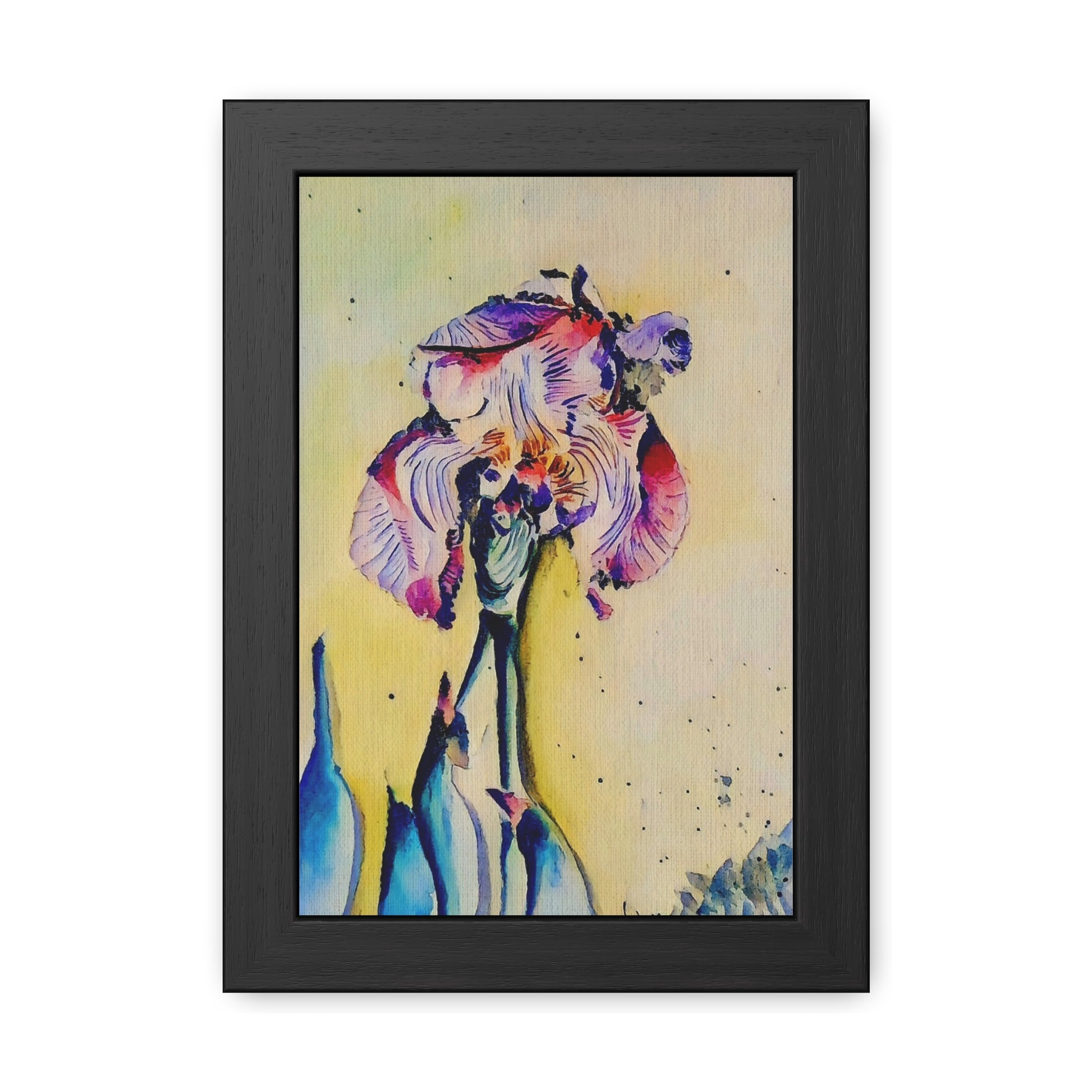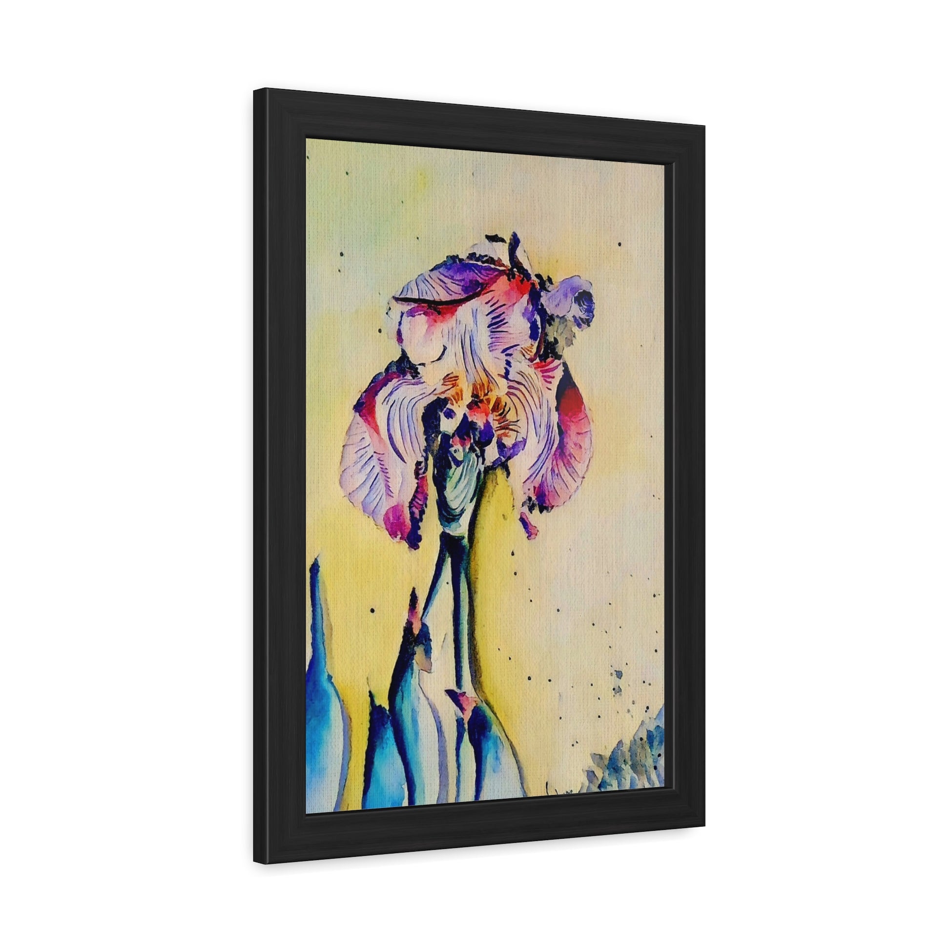 Colorful iris watercolor art print on a vibrant yellow backdrop, perfect for adding floral beauty to your home decor. This vibrant and cheerful framed poster is ideal for brightening up living rooms and bedrooms, giving off a happy and joyful vibe. It is relevant for those who appreciate floral art and want to add a pop of color to their living spaces. Great for springtime, birthdays, or any occasion that calls for a burst of color and beauty.