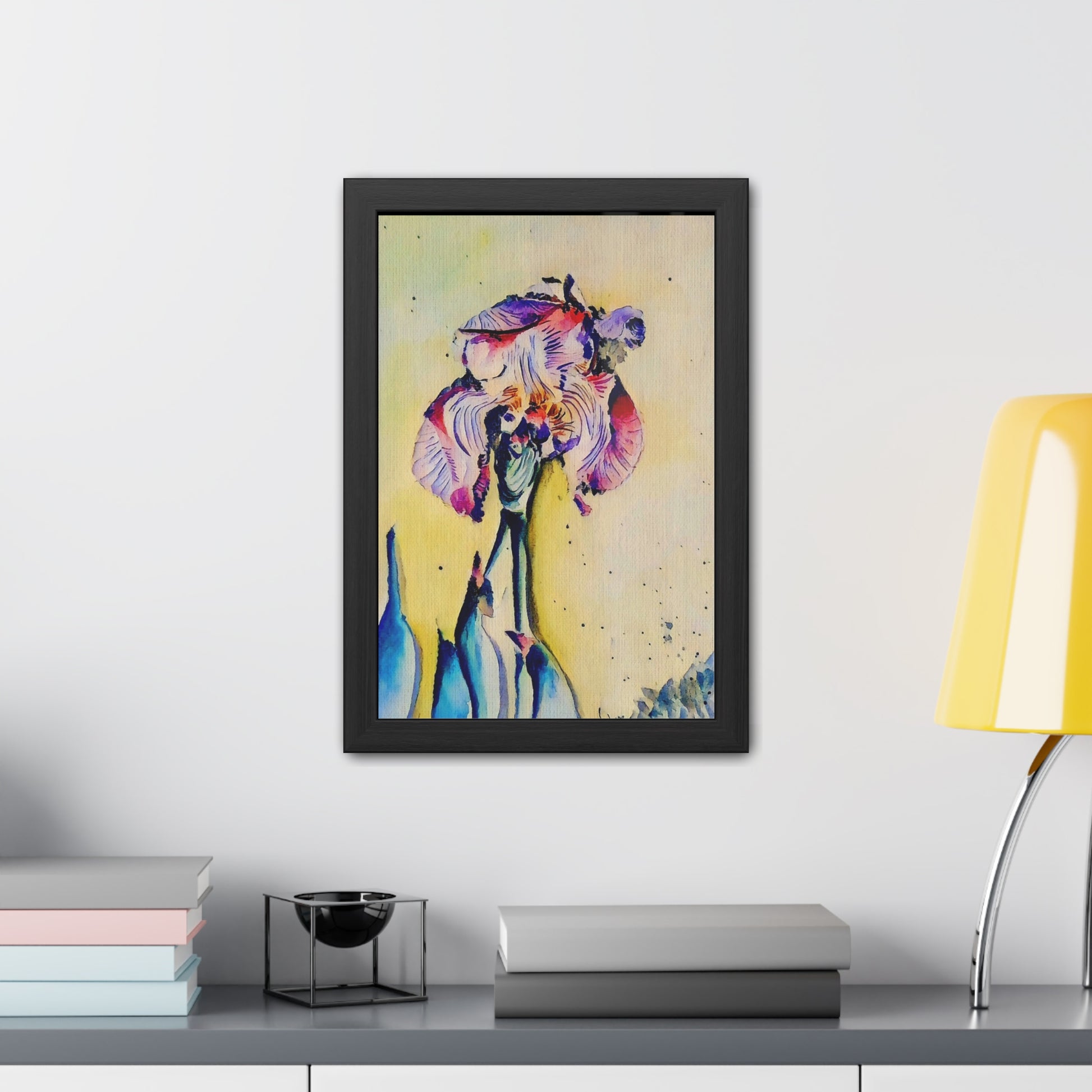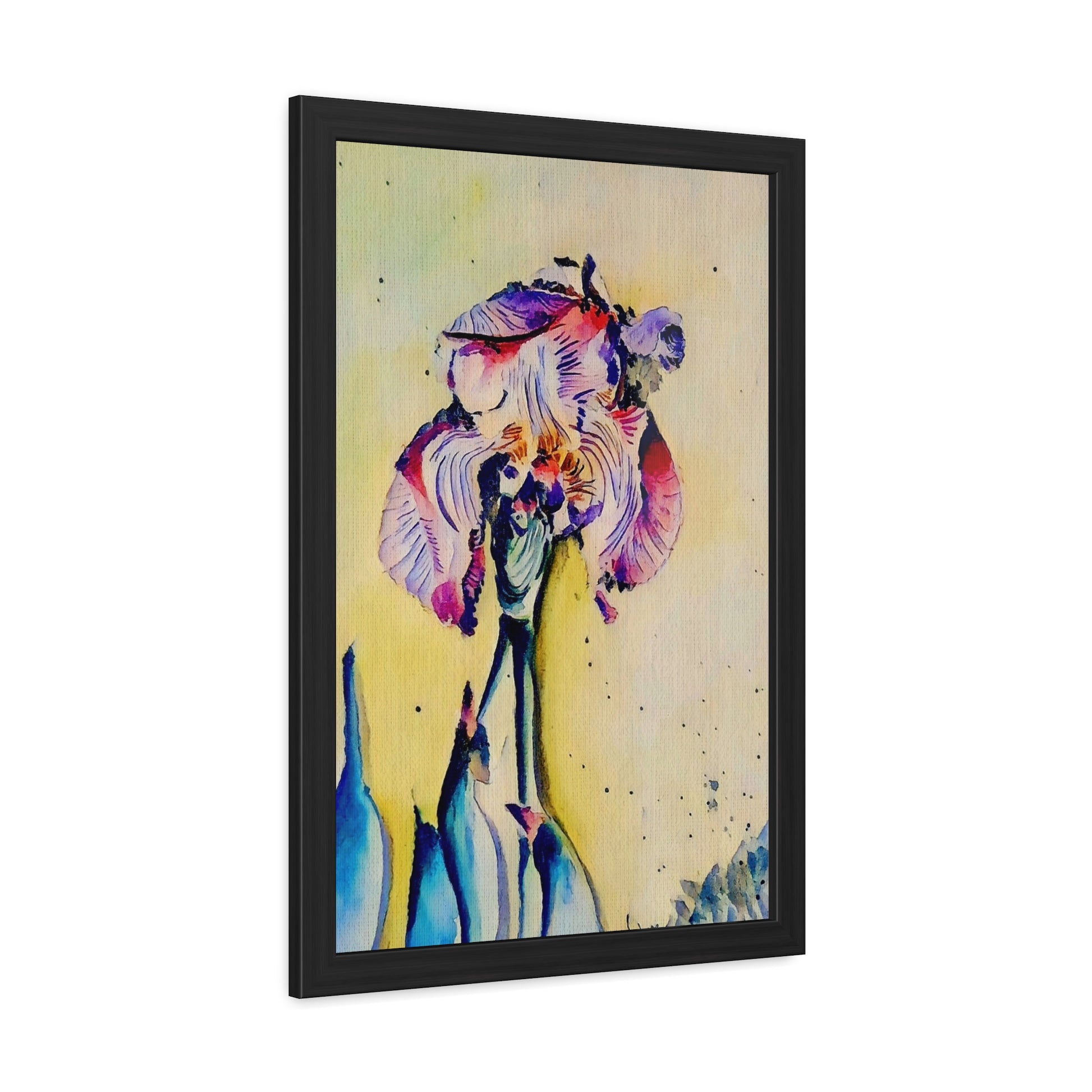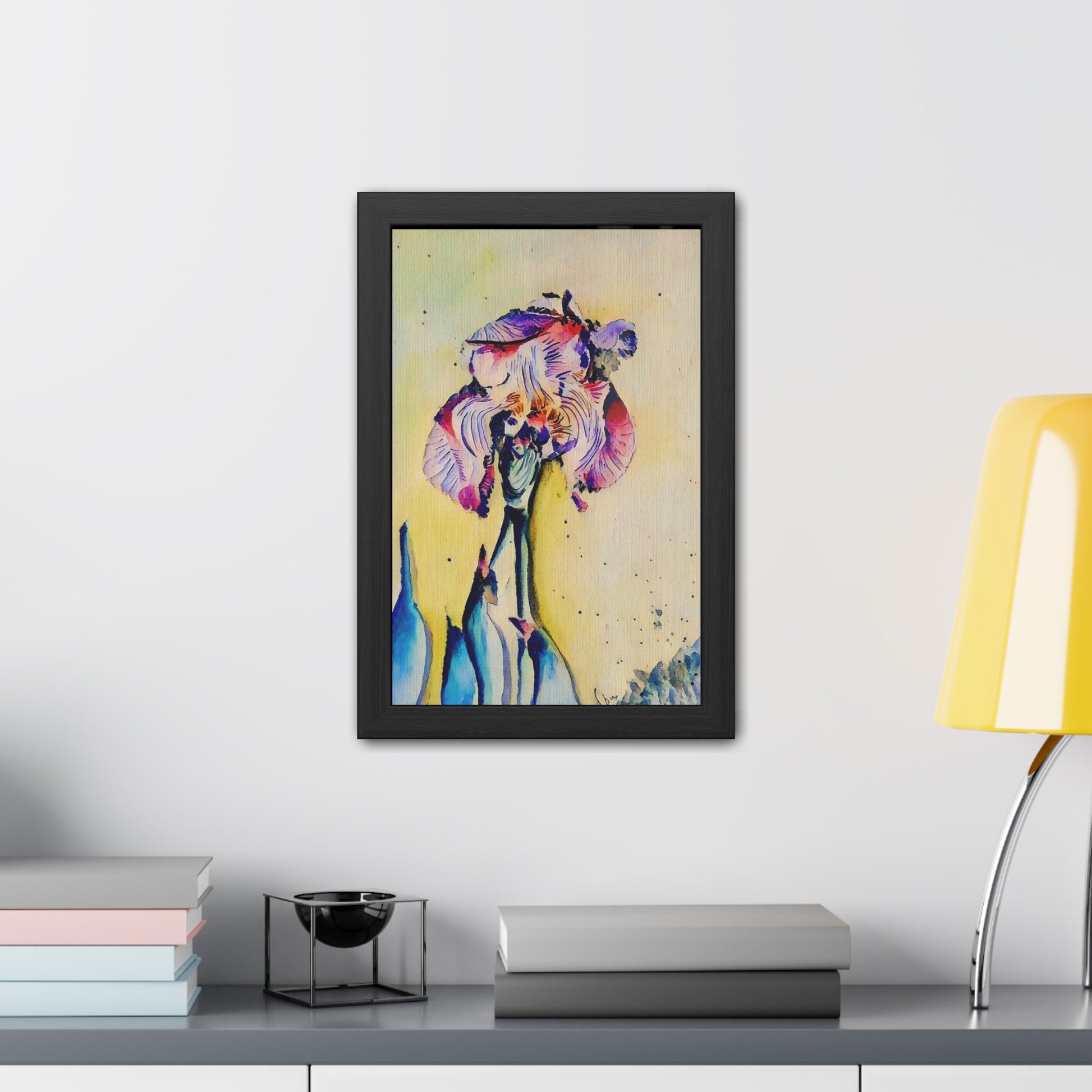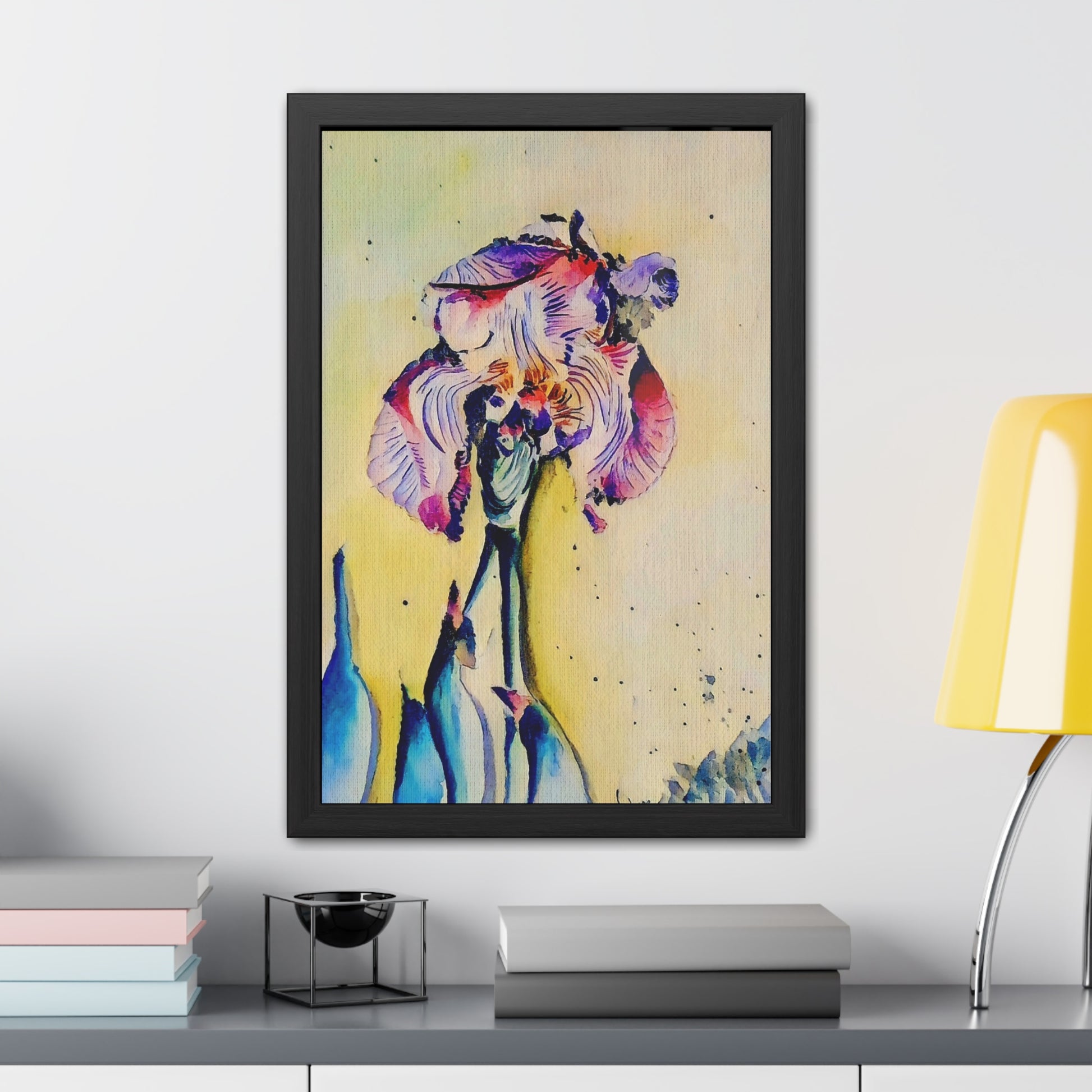 Colorful iris watercolor art print on a vibrant yellow backdrop, perfect for adding floral beauty to your home decor. This vibrant and cheerful framed poster is ideal for brightening up living rooms and bedrooms, giving off a happy and joyful vibe. It is relevant for those who appreciate floral art and want to add a pop of color to their living spaces. Great for springtime, birthdays, or any occasion that calls for a burst of color and beauty.