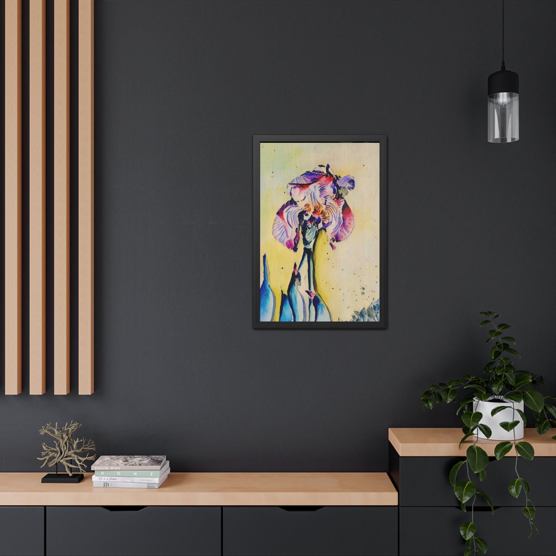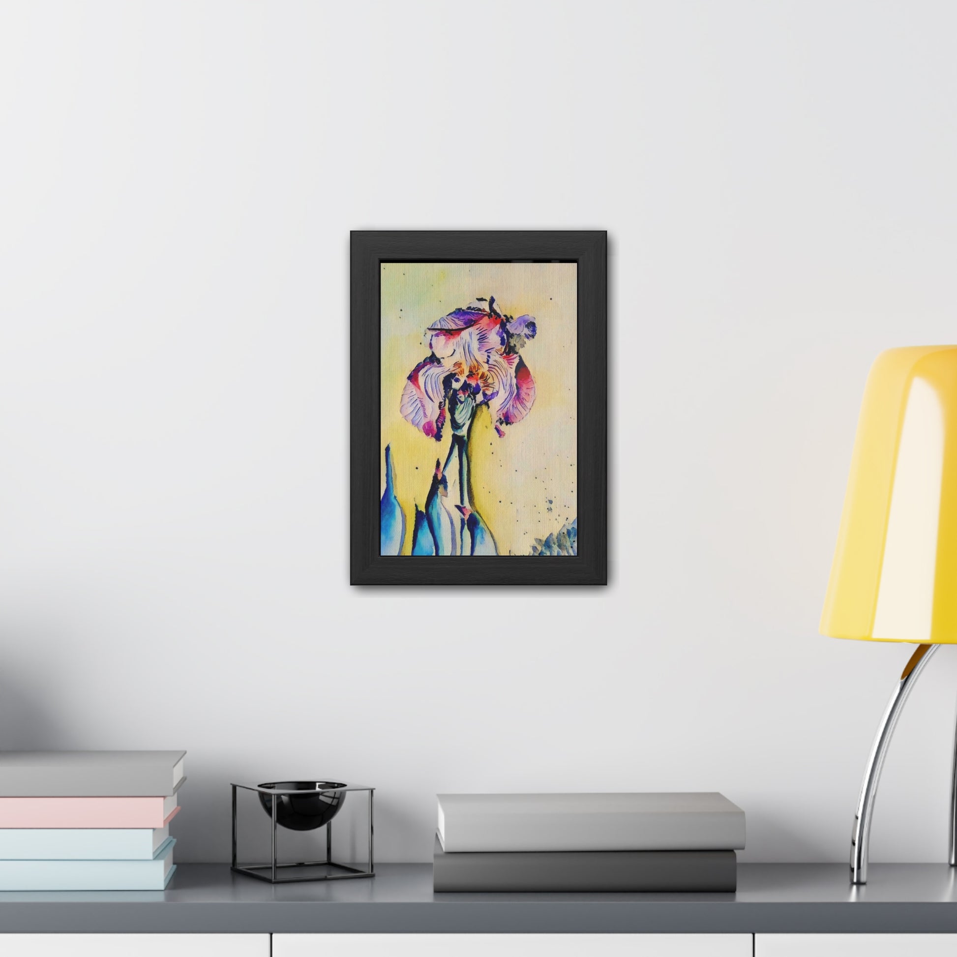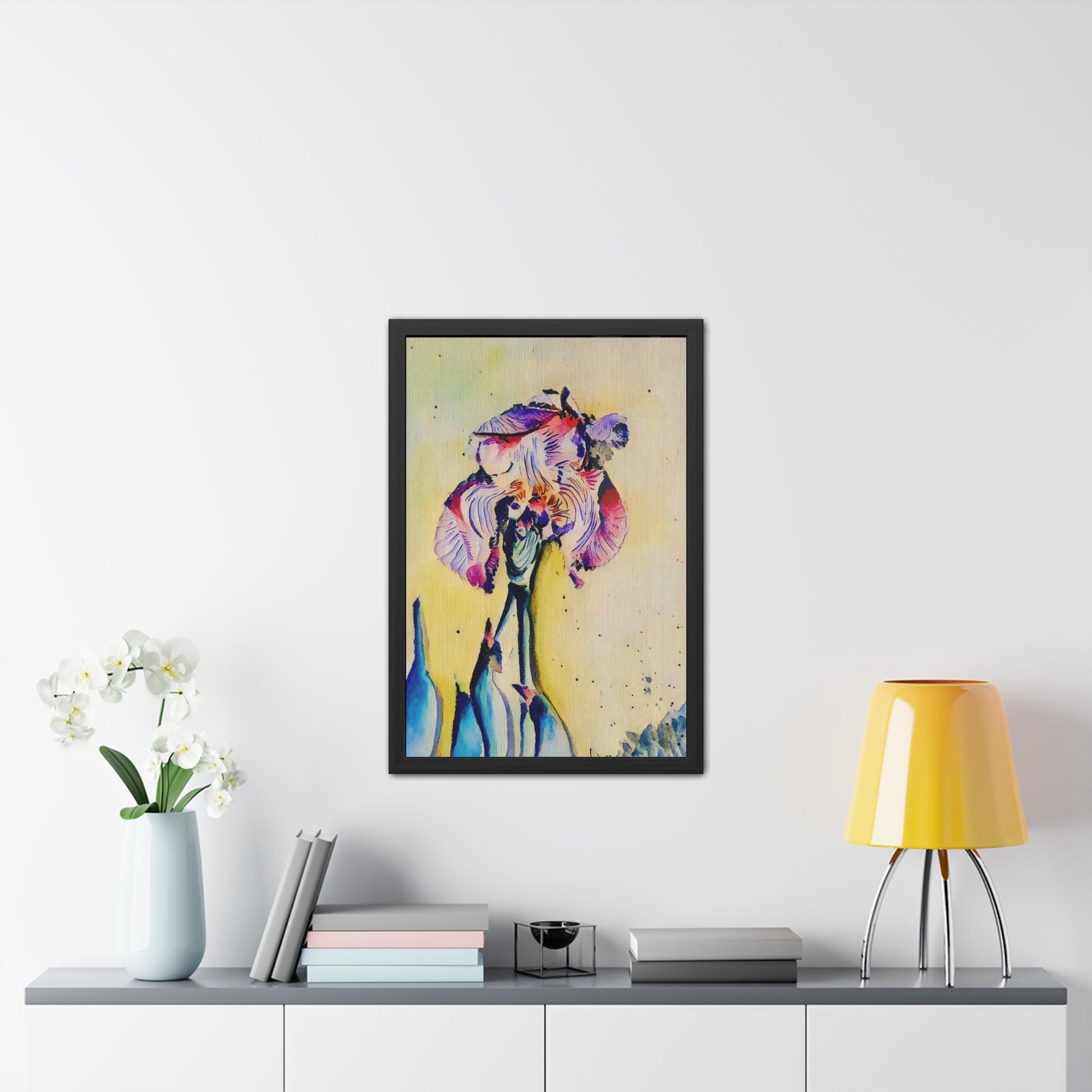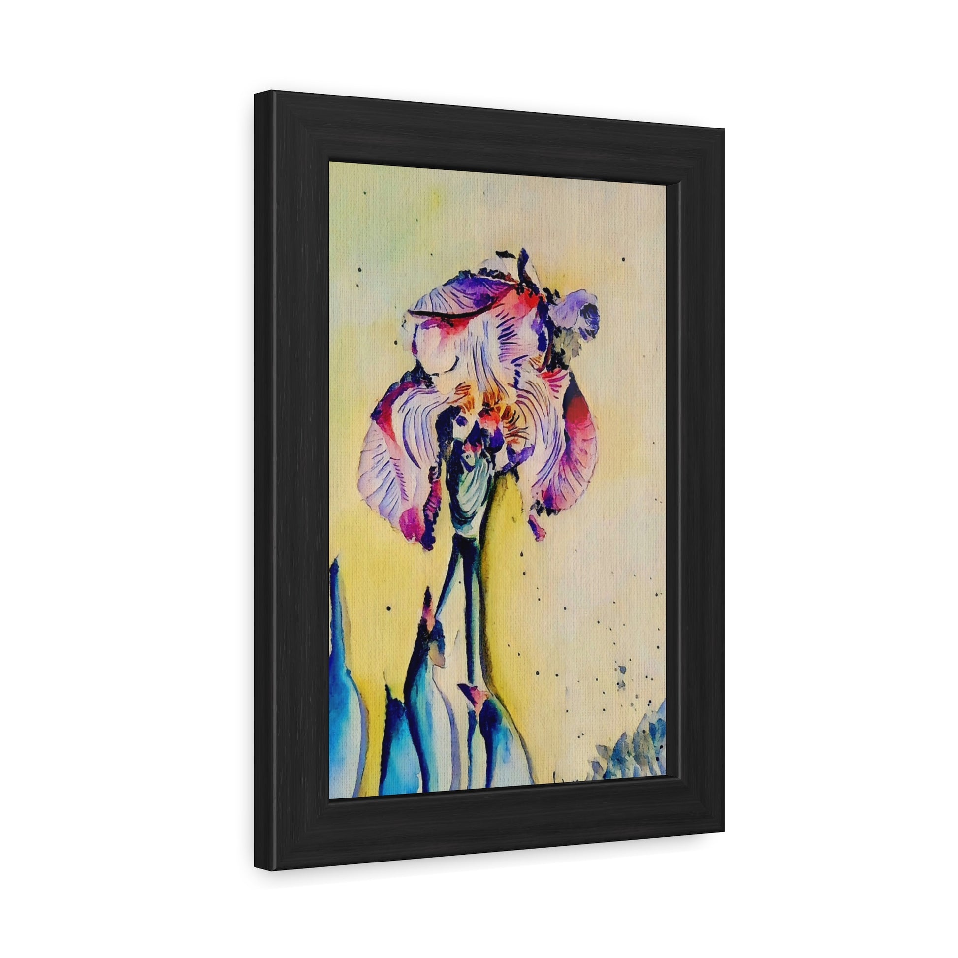 Colorful iris watercolor art print on a vibrant yellow backdrop, perfect for adding floral beauty to your home decor. This vibrant and cheerful framed poster is ideal for brightening up living rooms and bedrooms, giving off a happy and joyful vibe. It is relevant for those who appreciate floral art and want to add a pop of color to their living spaces. Great for springtime, birthdays, or any occasion that calls for a burst of color and beauty.