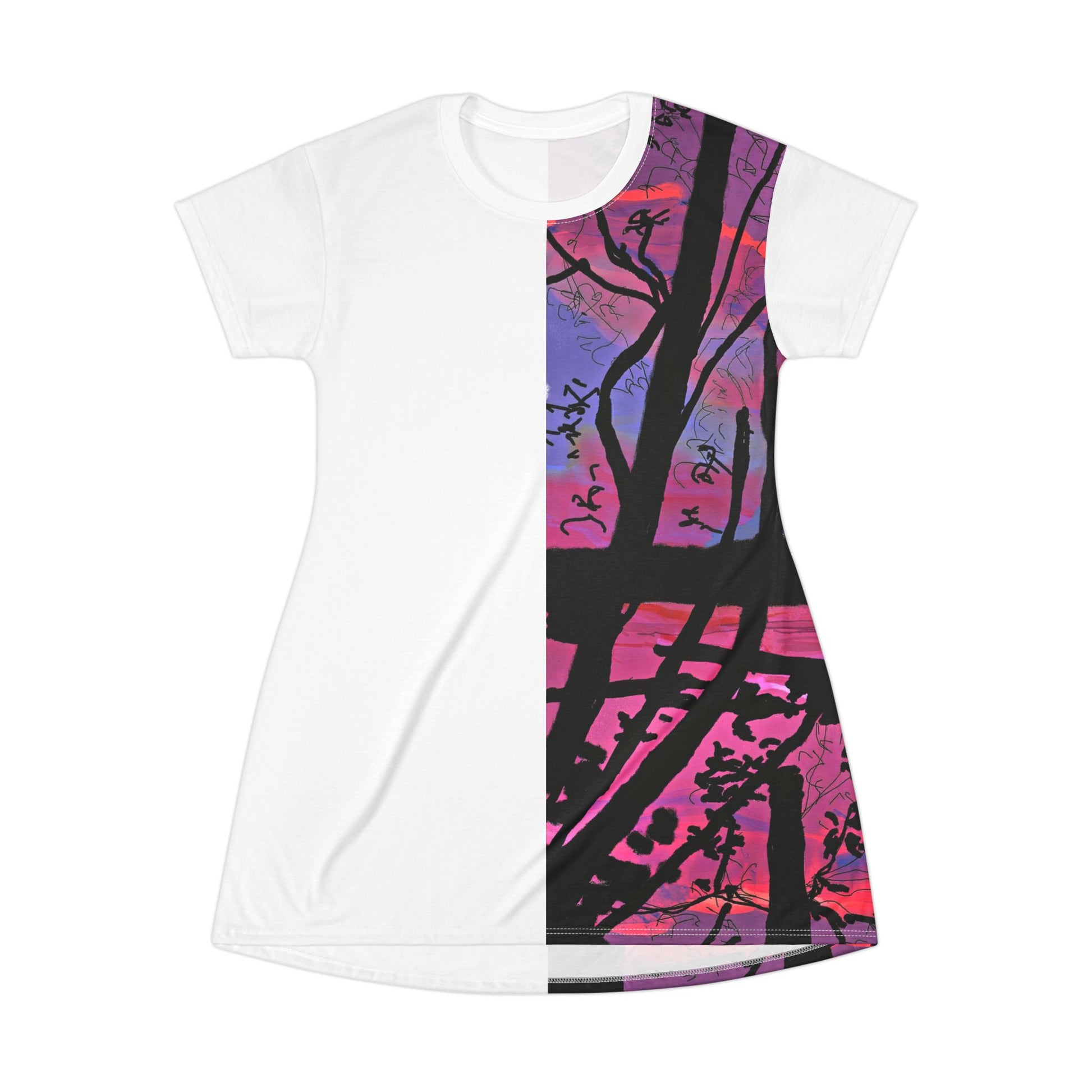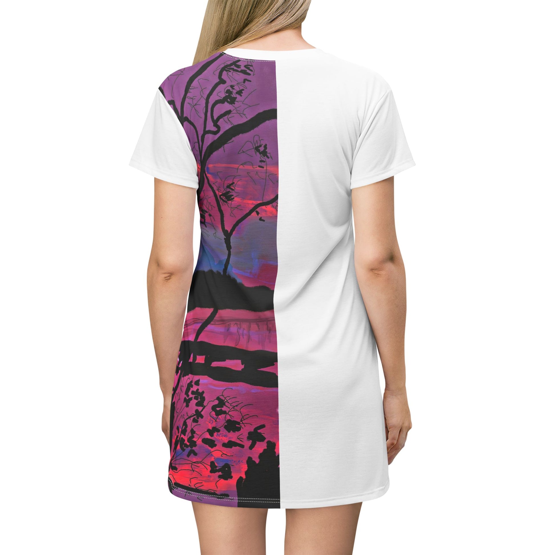 Stunning dress with blue red hue landscape print, white accent, and nice silhouette of trees. Very warm, cozy, and showcases a stunning original art print. Perfect for nature lovers and those who appreciate unique, artistic fashion. Ideal for special occasions, outdoor events, and casual gatherings.