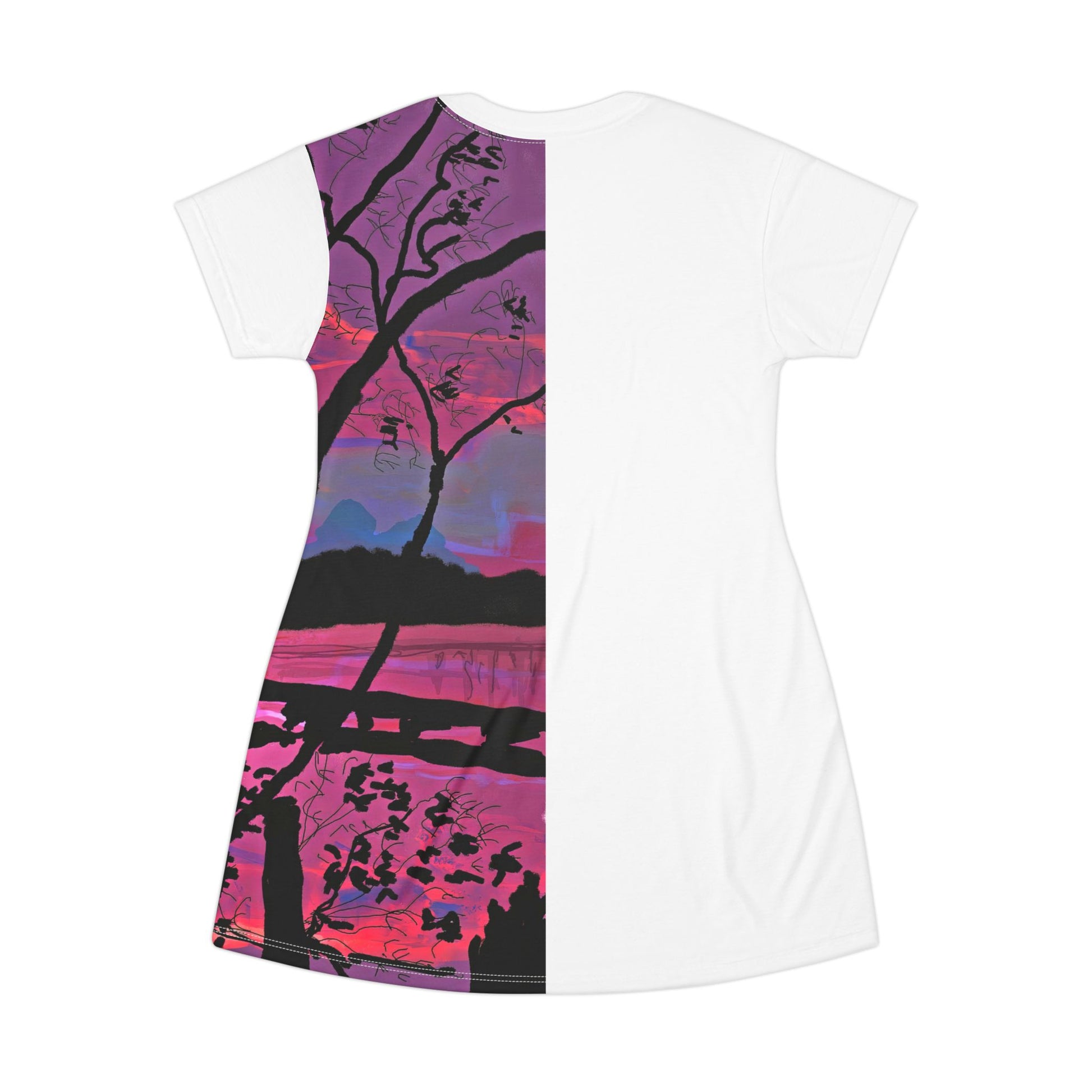 White | Landscape Print T-Shirt Dress with Blue Red Hue