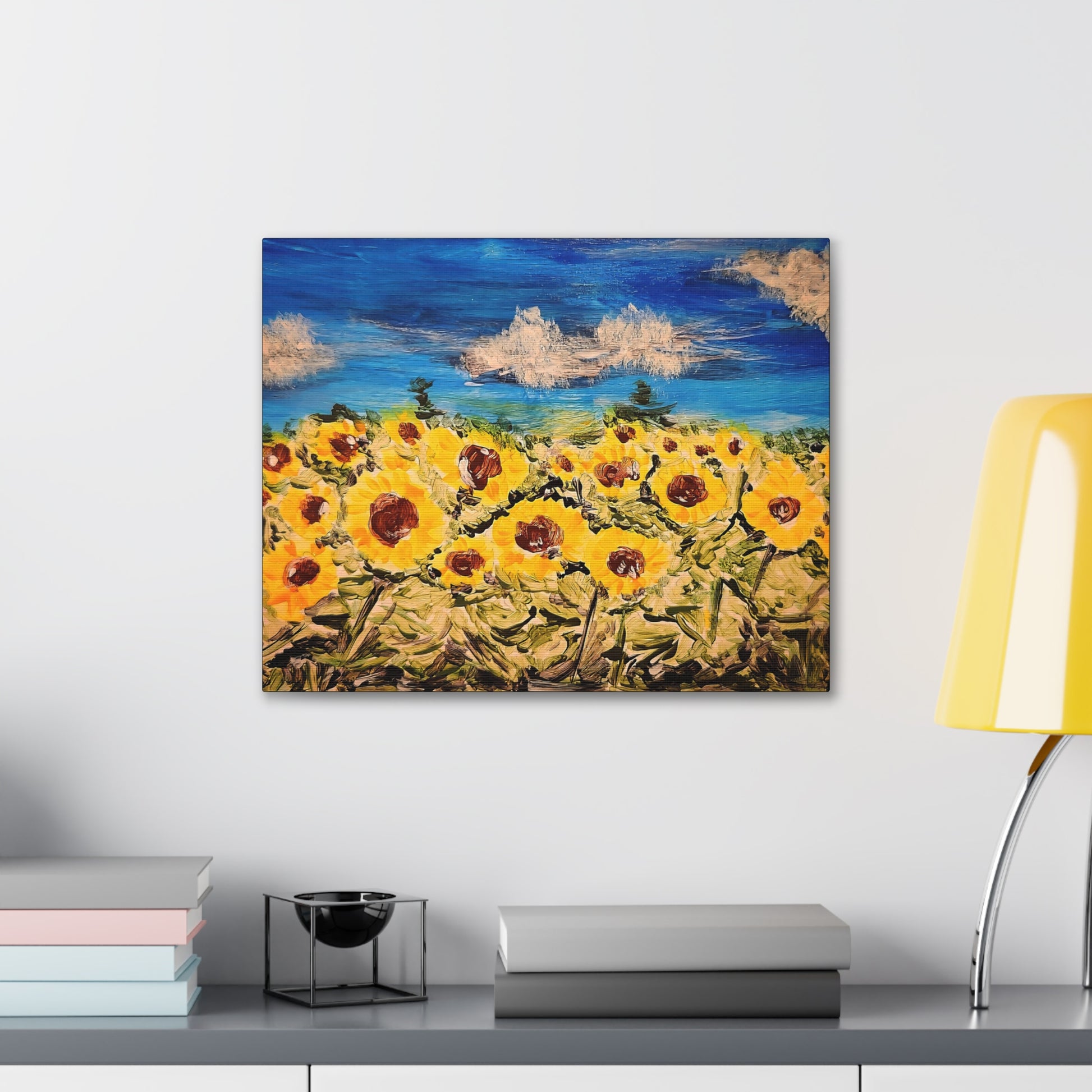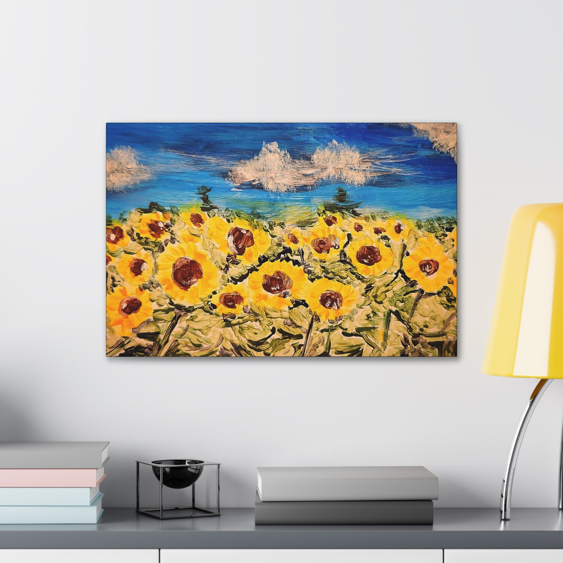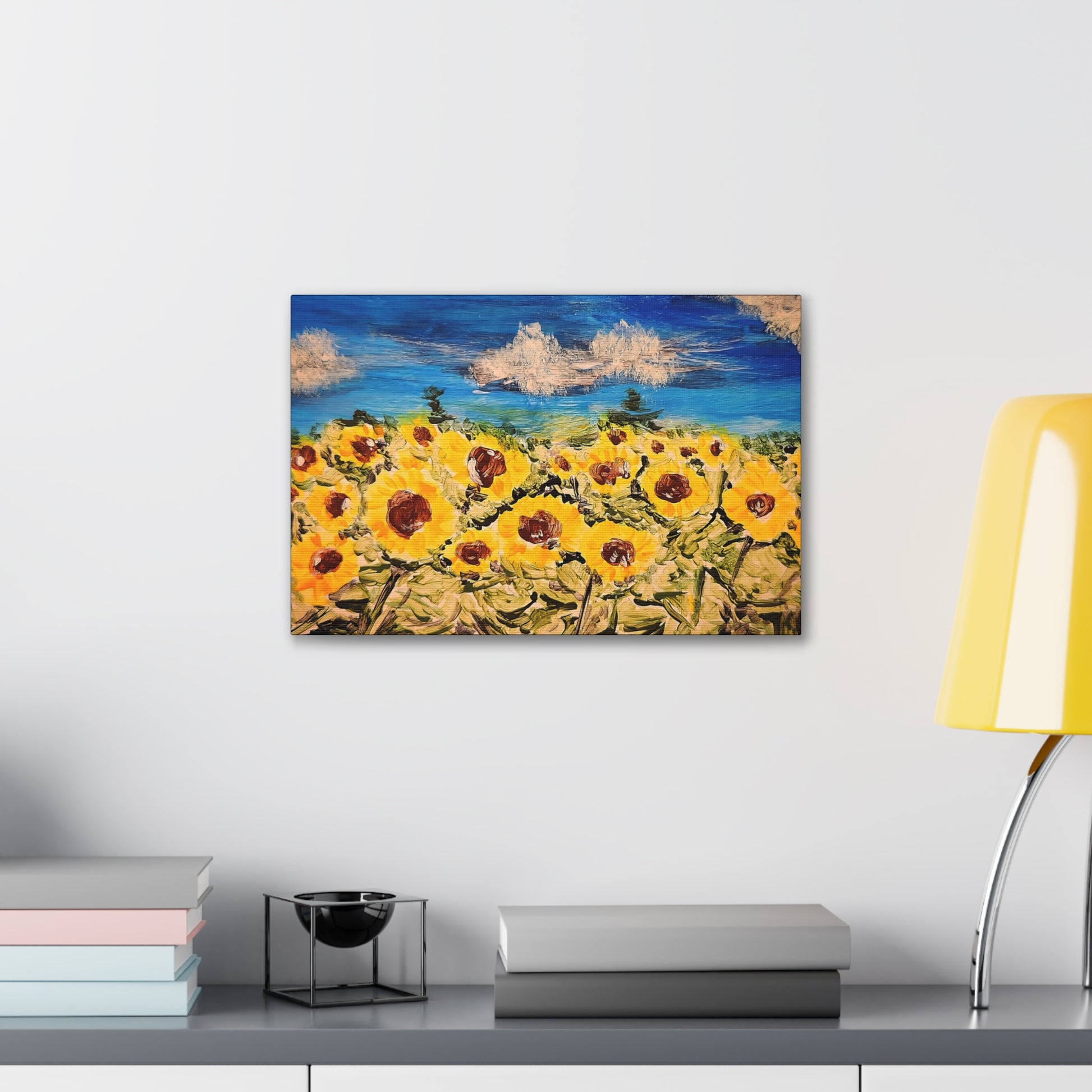 Bring the serendipitous beauty of a sunflower against a blue sky into your home with this stunning acrylic art print on canvas. Perfect for nature lovers and those seeking a touch of the outdoors indoors. Ideal for brightening up any room, especially relevant for spring and summer decor.