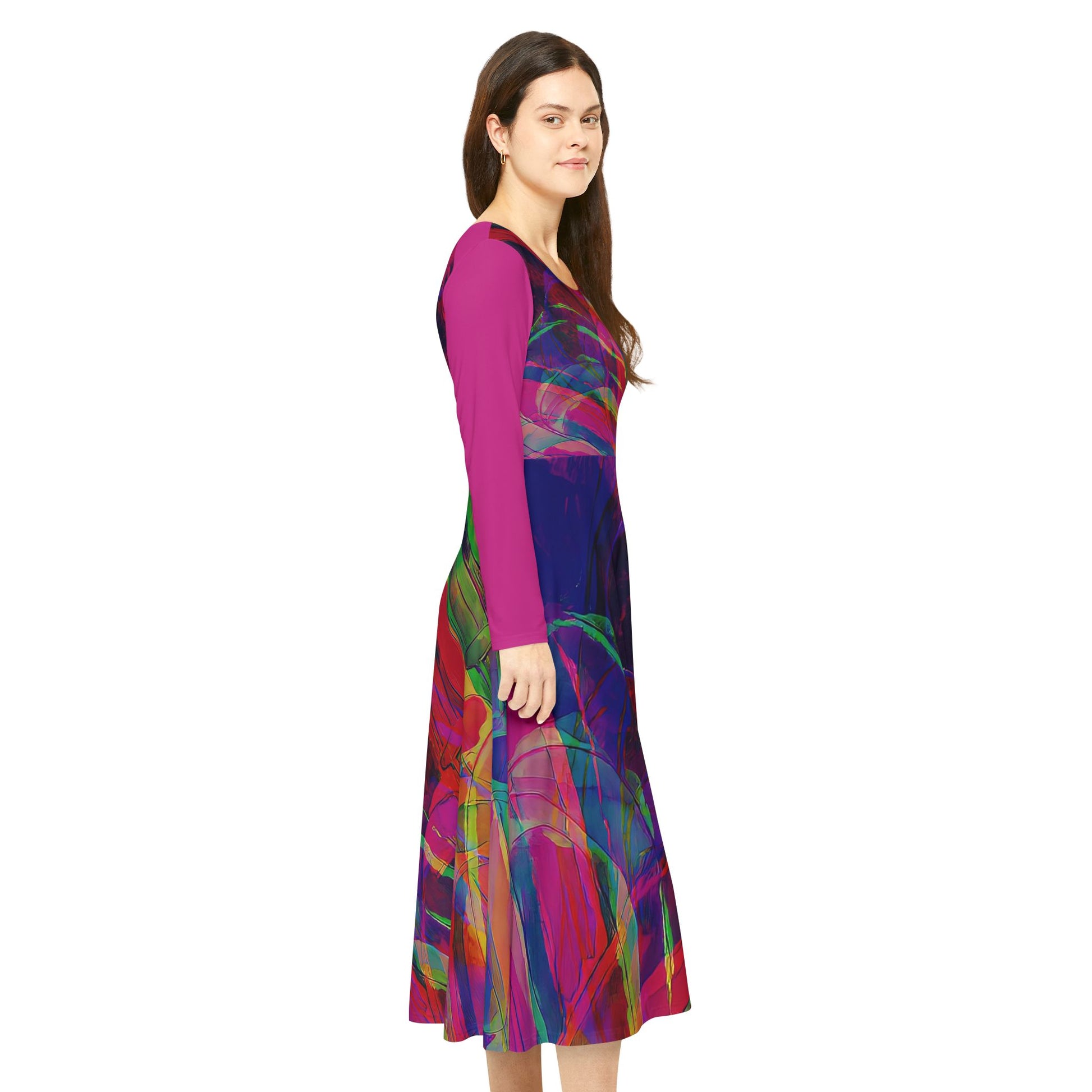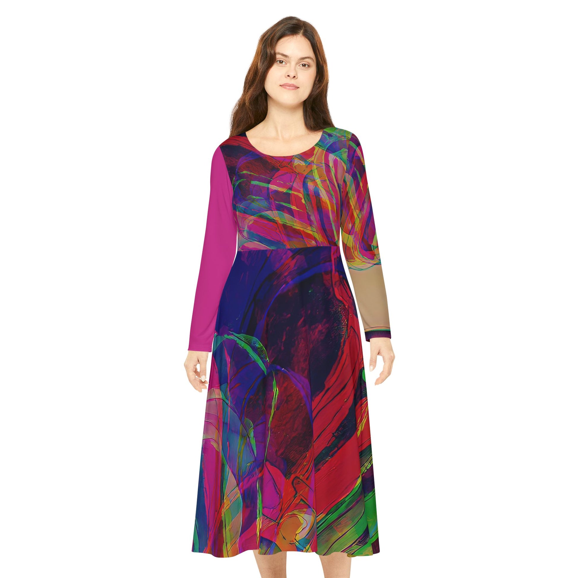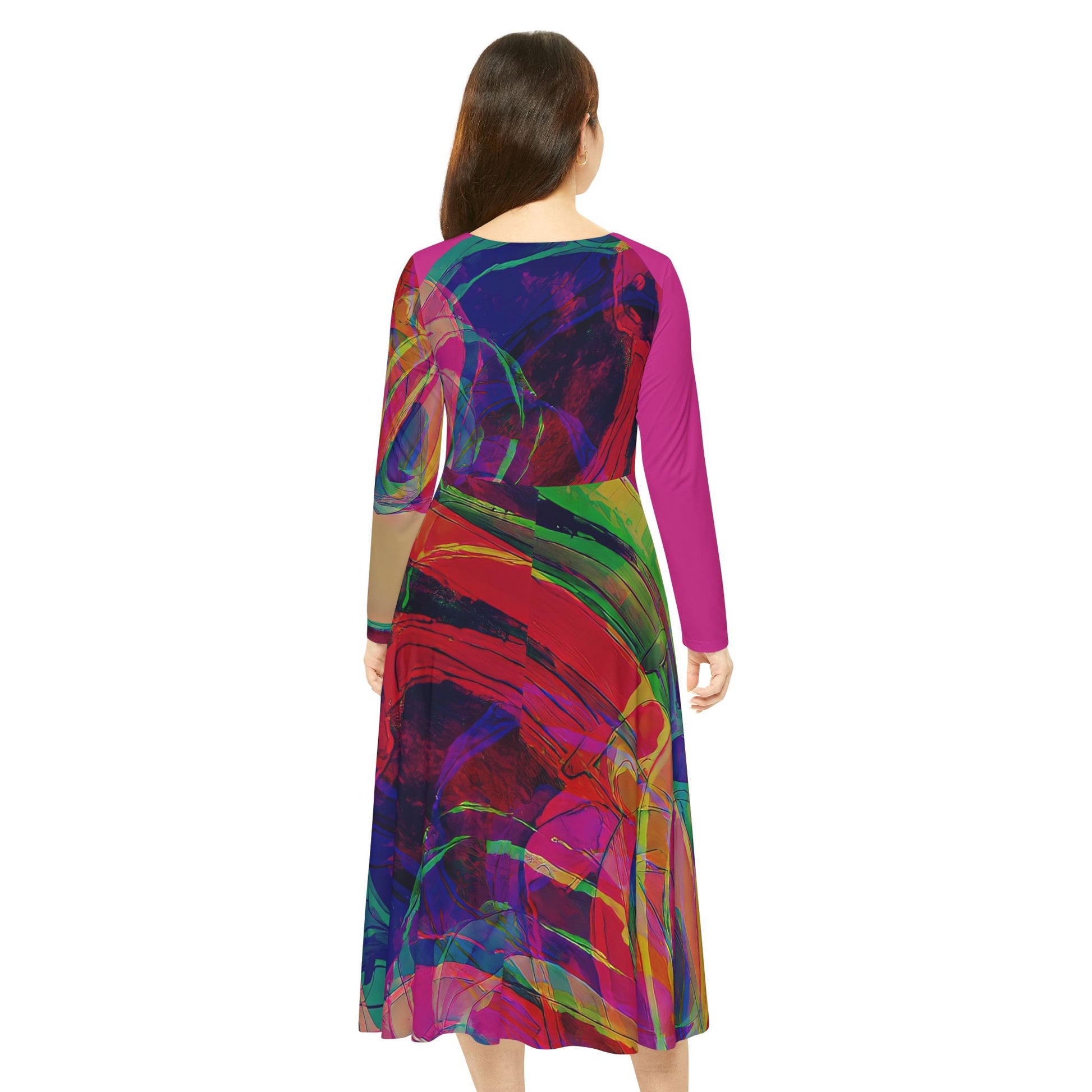 A vibrant Women's Long Sleeve Dance Dress featuring a cool headphone girl with chic style, perfect for those who vibe like a party. This dress is designed to radiate vibrance and energy, a must-have for dance enthusiasts and fashion-forward individuals. Ideal for celebrations, parties, and music festivals.